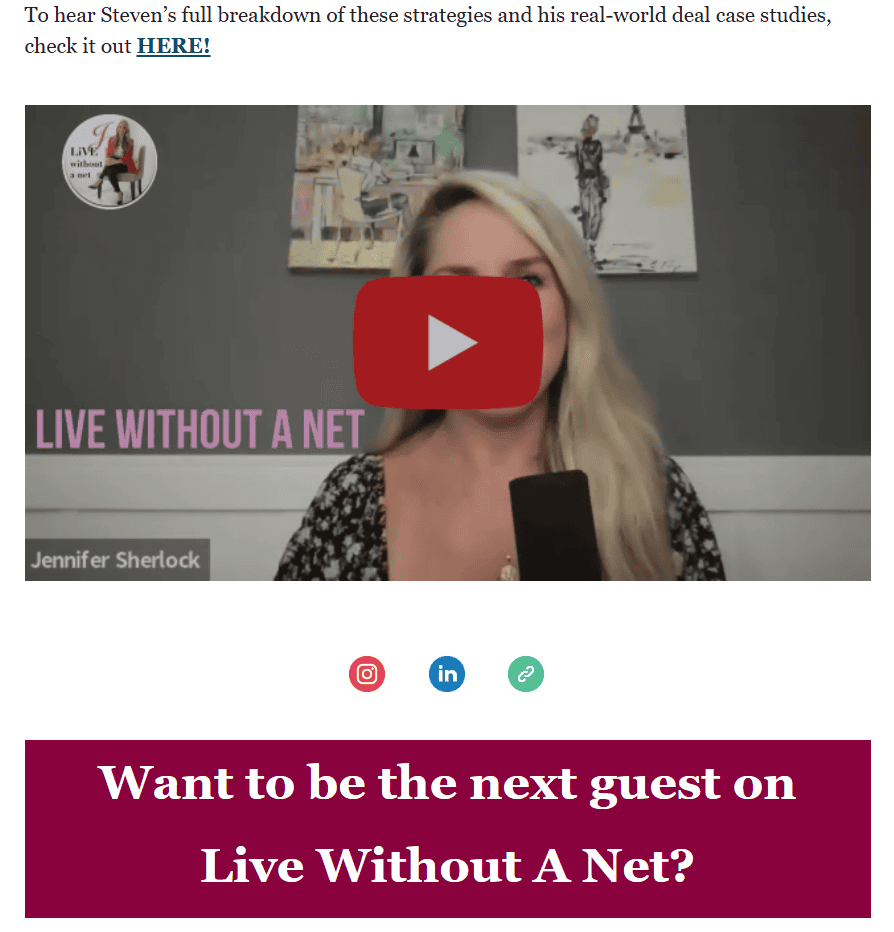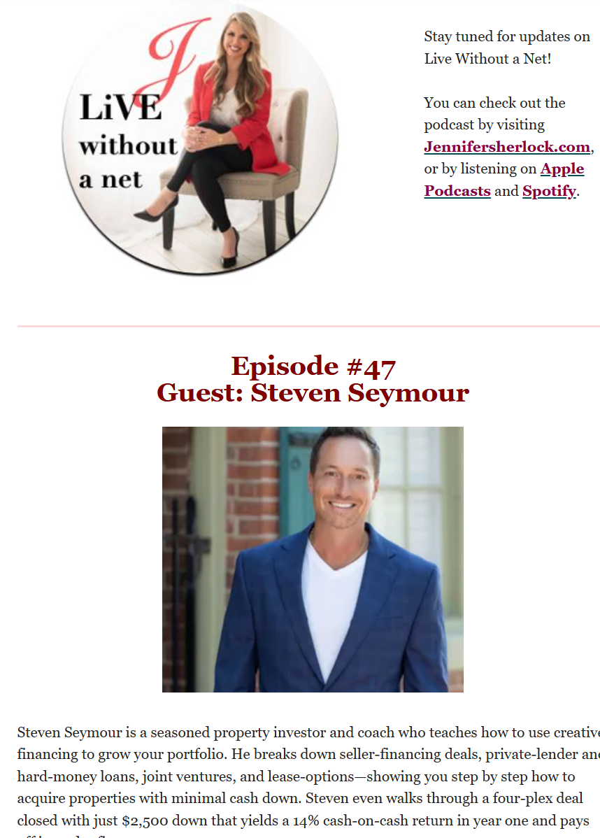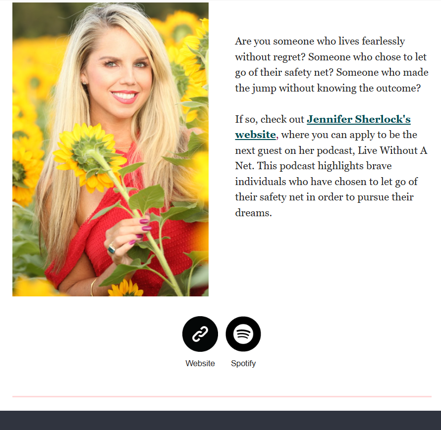 Live Without A Net is hosted by Jennifer Sherlock, the President of Jenna Communications. This podcast showcases entrepreneurs who live fearlessly without regret and have the ambition to create something. Jennifer Sherlock will interview those who have chosen to let go of their safety net in order to survive. If you are brave and like to live life with risk, then you may just be our perfect guest. This questionnaire will determine if you’re a great fit for the podcast and help us understand why your amazing story should be heard.
